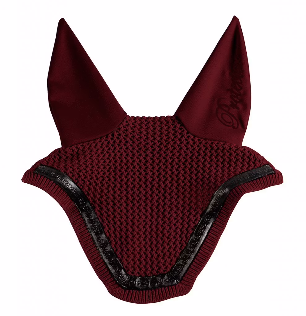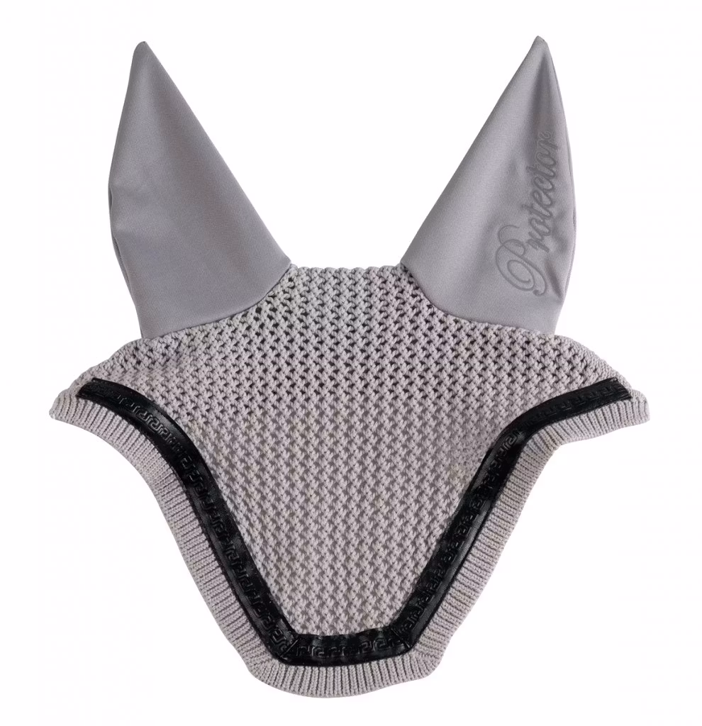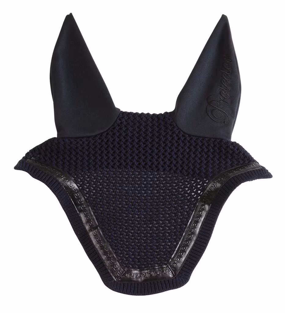 Handstickad flughuva i fint mönster kantad med skinnband i svart.