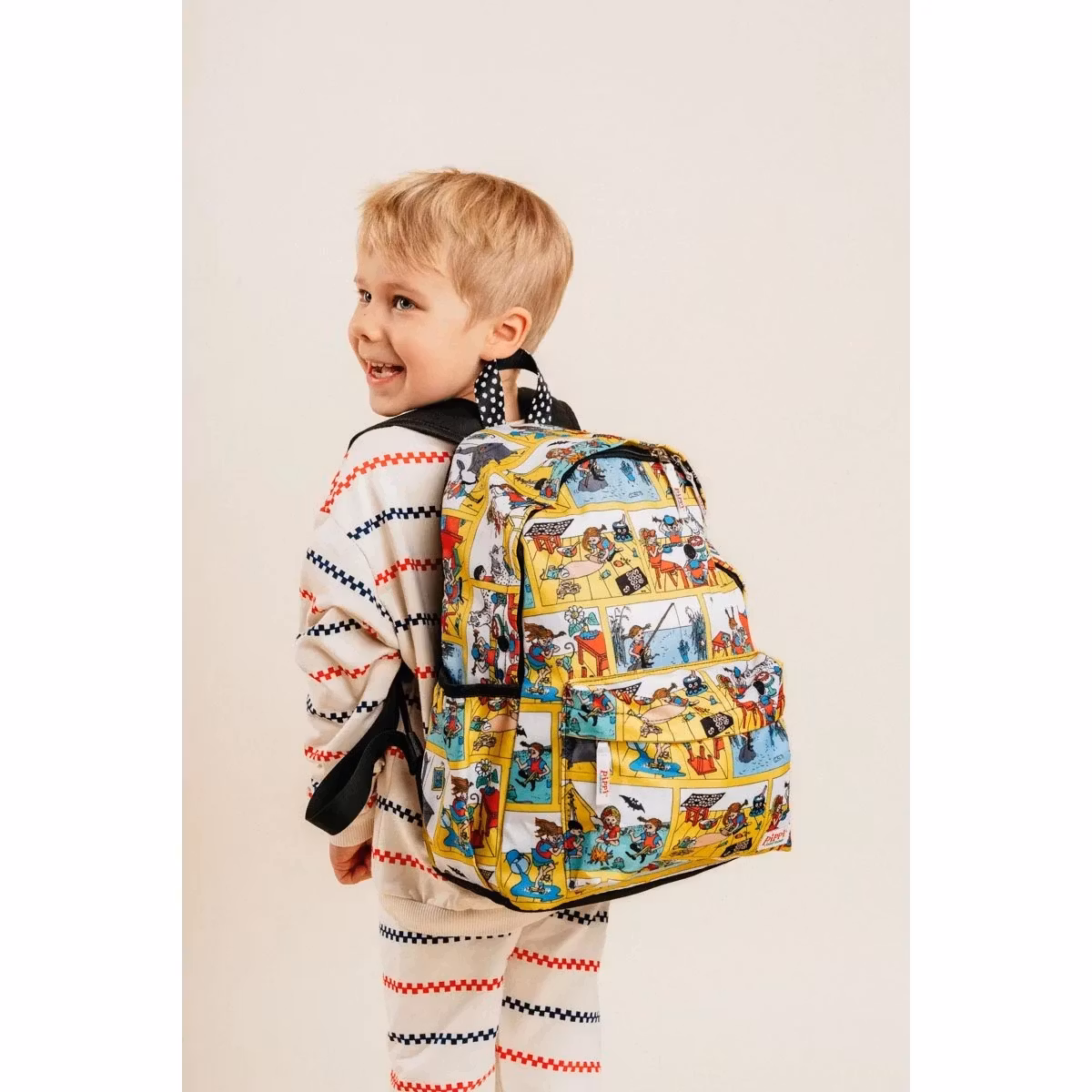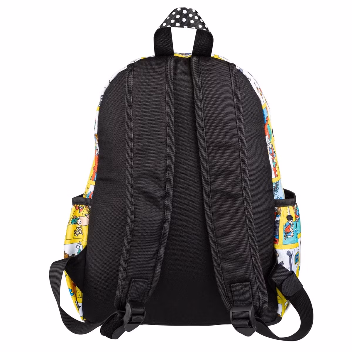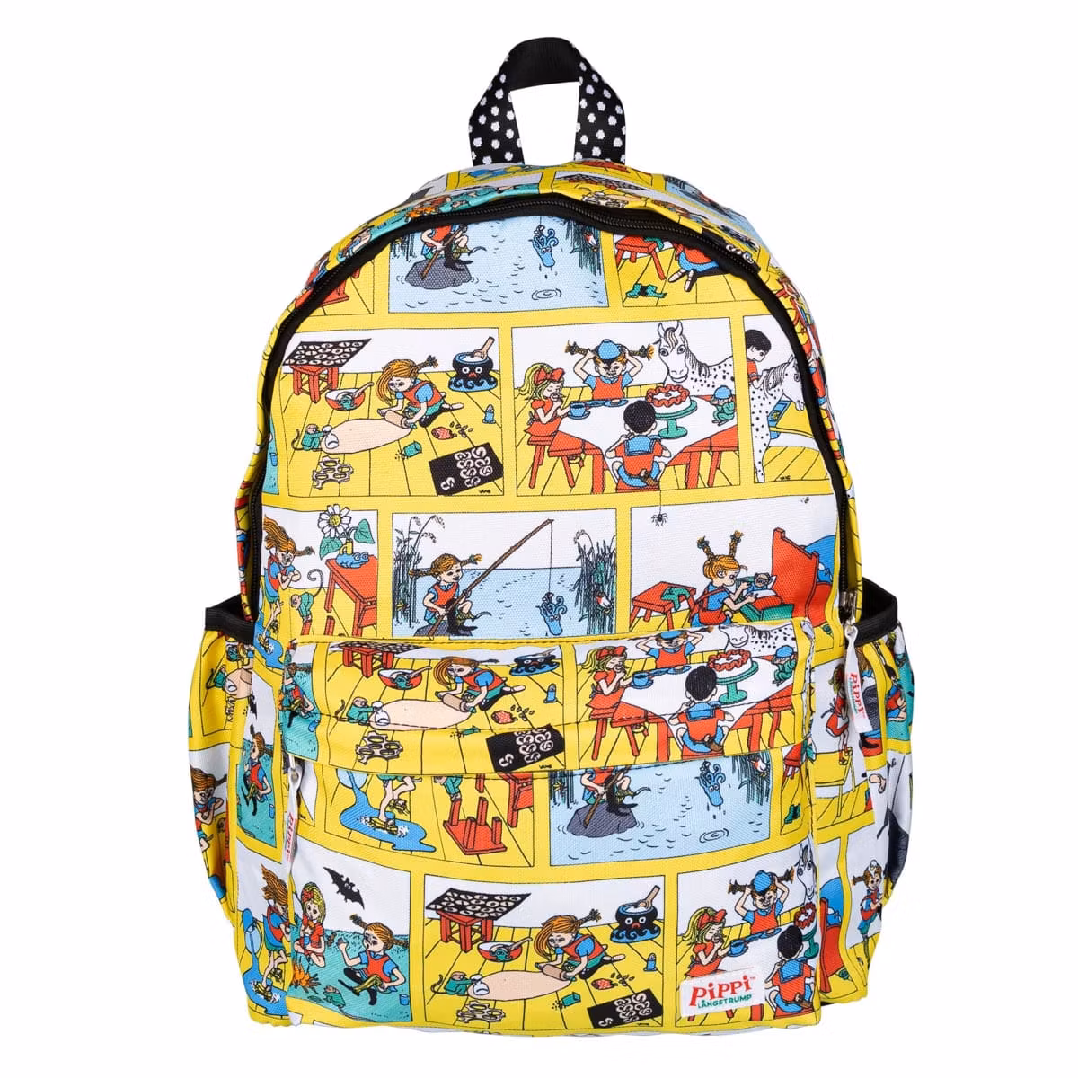 Stadig ryggsäck av slittålig polyestercanvas, helmönstrad med roliga Pippi Långstrump-bilder. Tvåvägsblixtlås, blixtlåsförsedd ytterficka, sidfickor för dricksf
