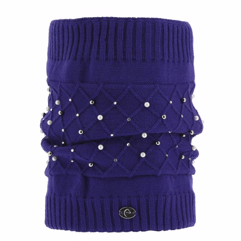 Stickad tubschal med losanger och sömmar av strass och pärlor.