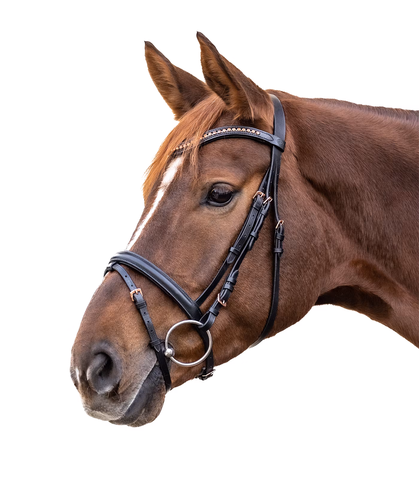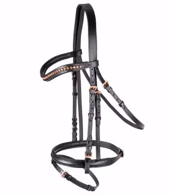 Träns med fin finish med svängt pannband med små rosédiamanter".Rostfria beslag med roséguldfinish. Komplett med vävribbtyglar, 19 mm bredd.Ett bra budgetaltern