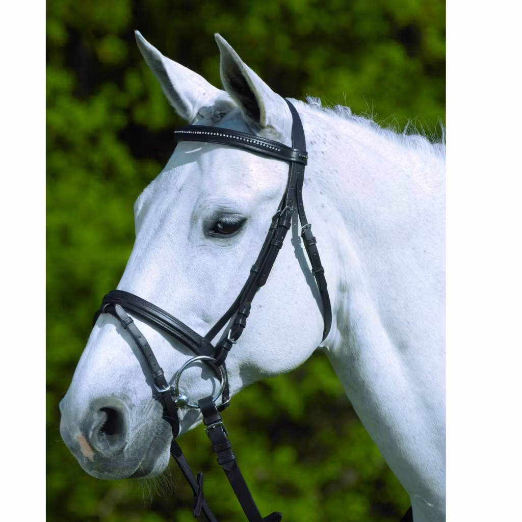 Ett komplett träns i slitstarkt läder. mjukt fodrat i nosgrimma och pannband. Pannband med ett pärlband av strass. Förnicklade järnbeslag, det bruna tränset har mässingsfärgad beslag. Vävribbtyglar 19 mm breda i ponnystorlek, och 16 mm för mini och shetlandsponny.