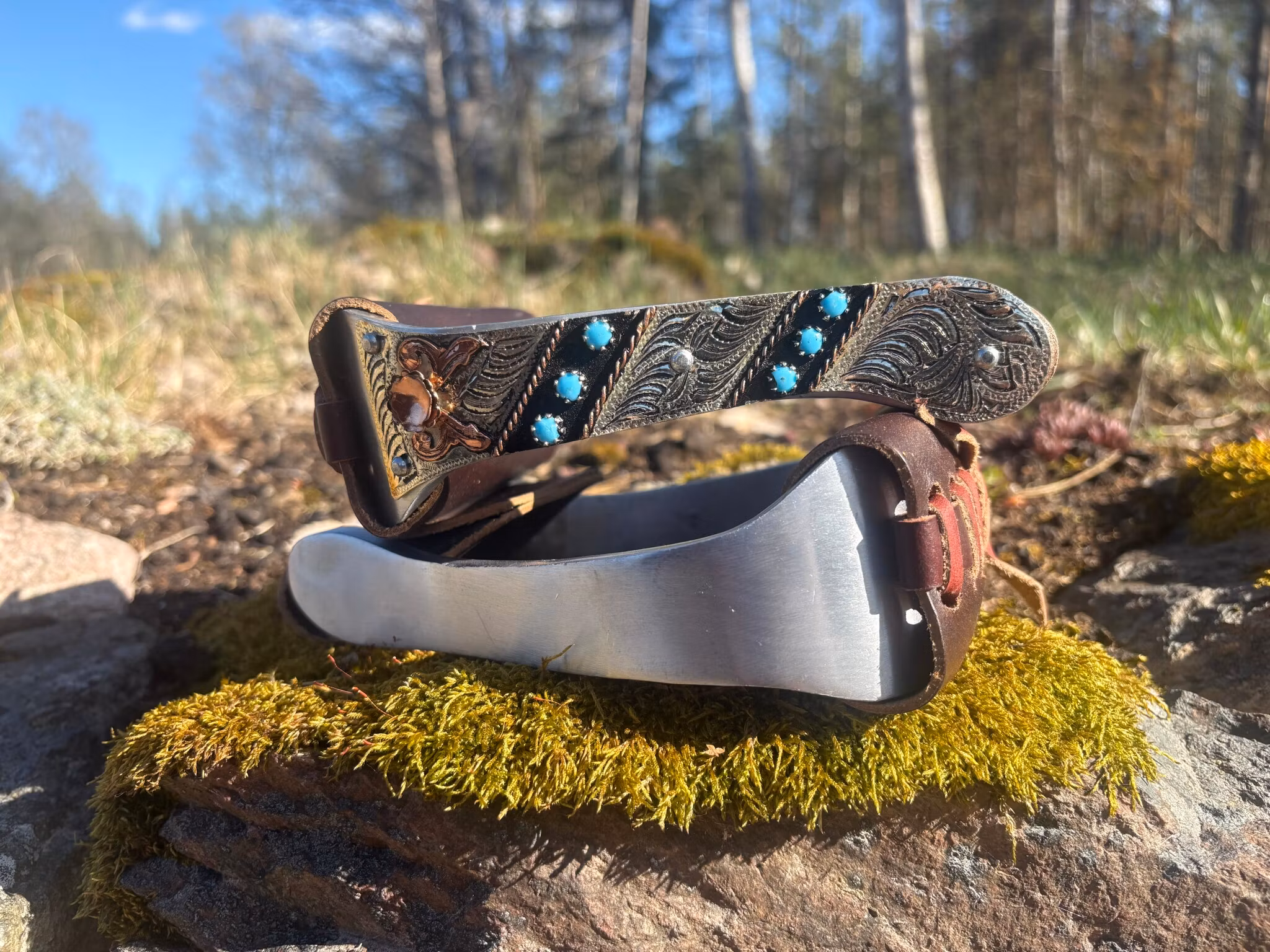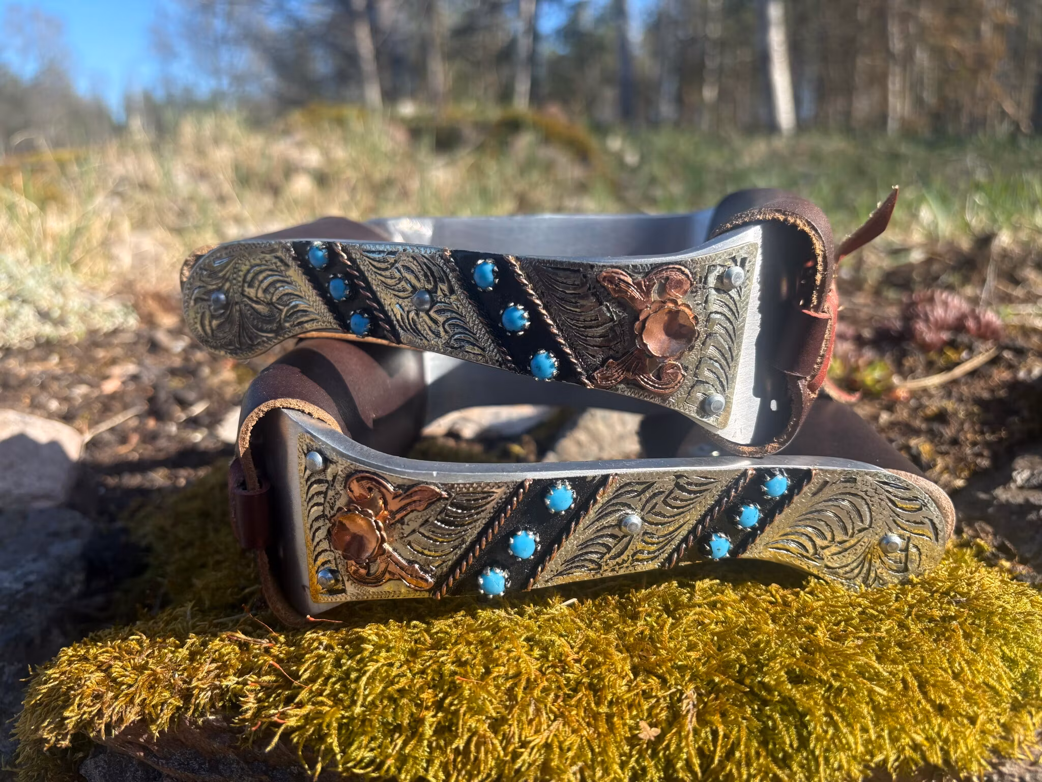 Hand engraved barrel racing stirrups with copper and turquoise. Aluminum base. Weight is 1 lb 12oz for the pair. Slightly wider across its base so your boot sit
