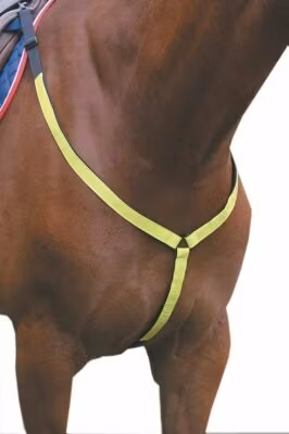 Neongul reflexbrösta med snabbspänne för fäste i sadeln. Fleecefodrad. Kan anpassas för ponny eller full.