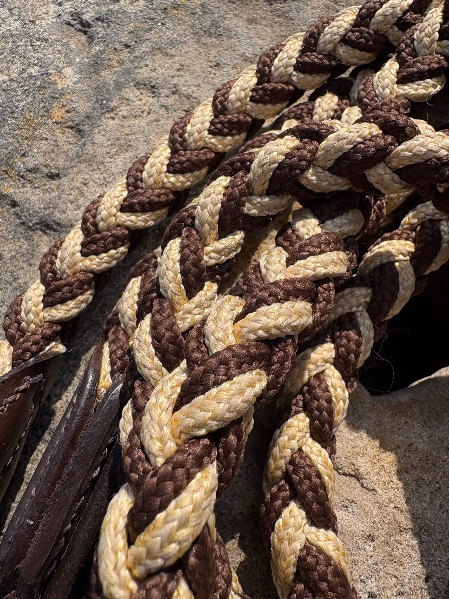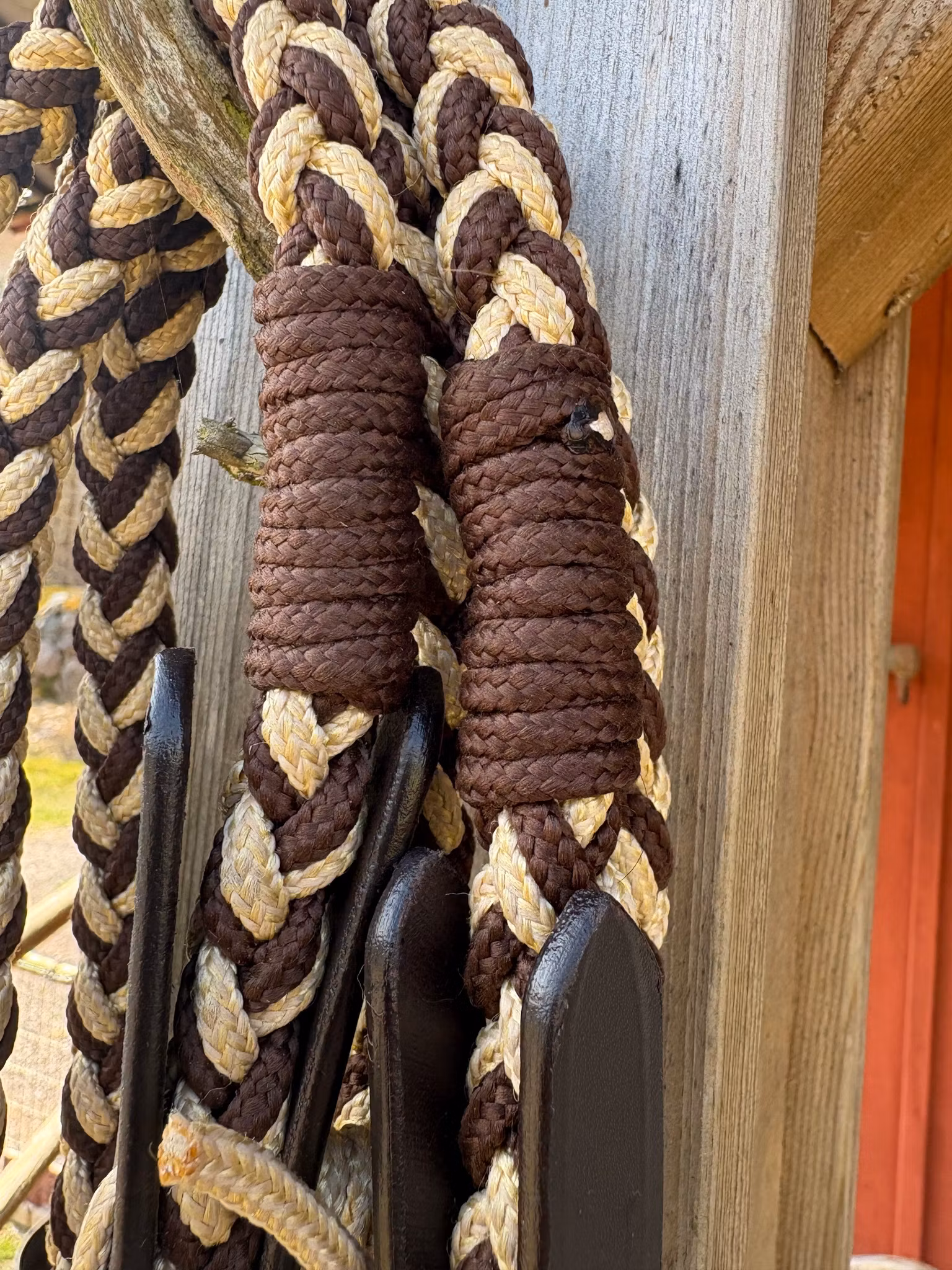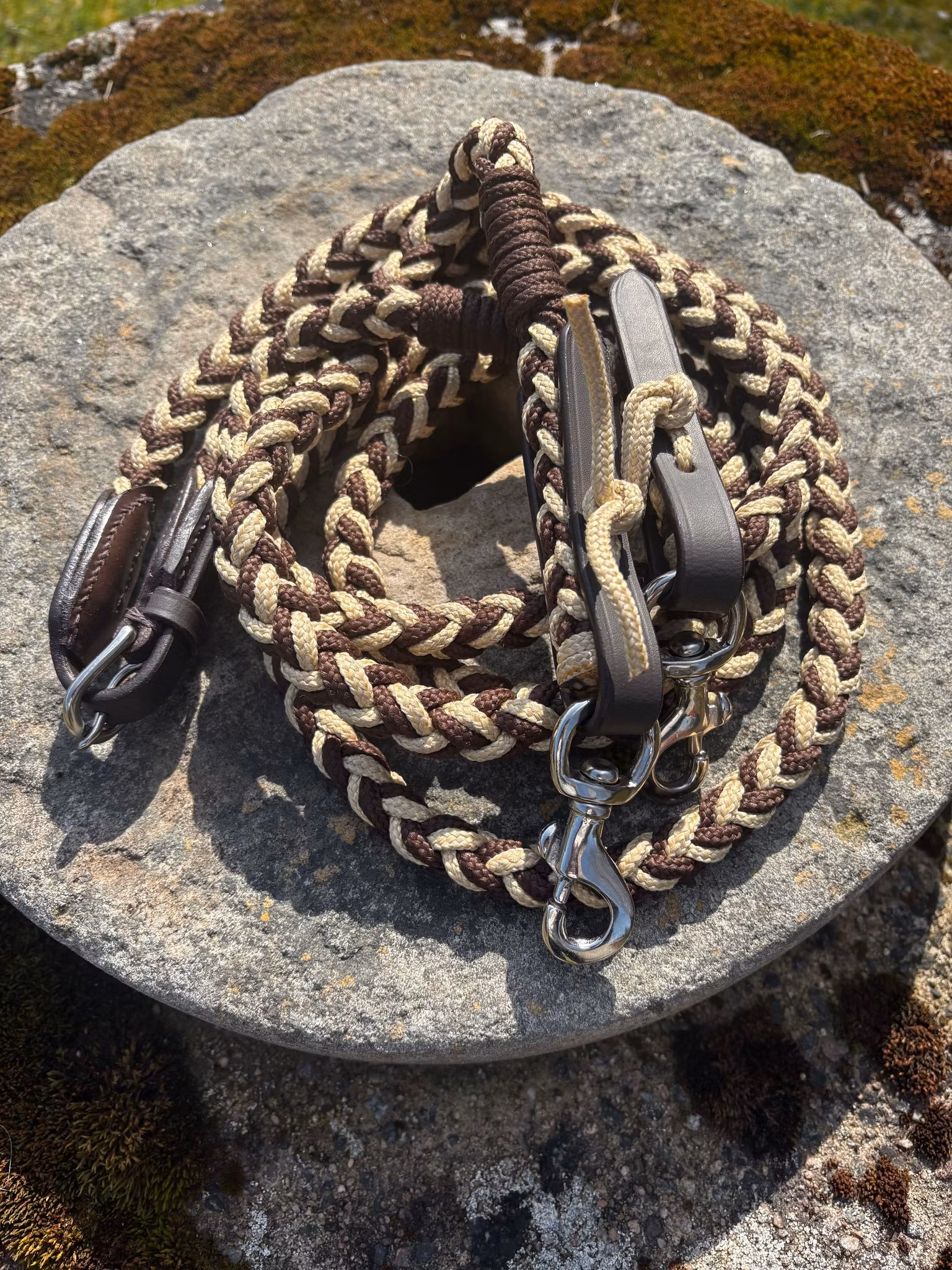 Snygga reptyglar tillverkade av flätat PP-rep. Med läderdelar och karbinhakar för snabbfäste.Total längd ca: 3 m. Färg: brun/beige.
