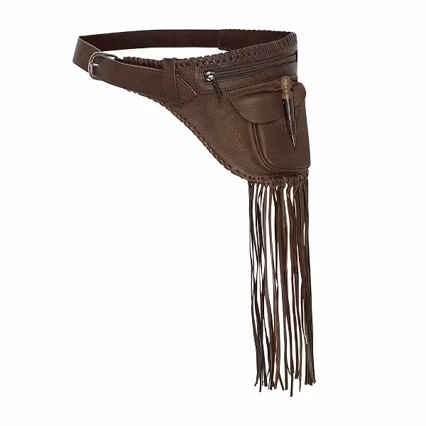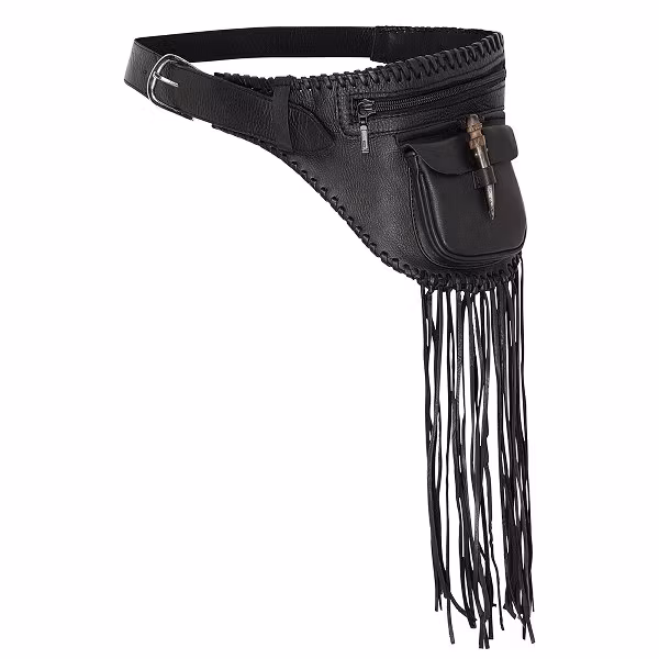 Cowhide leather leg bag with fringes and outer patch pocket with decorative saber tooth. It is versatile and can also be worn as a crossbody or shoulder bag.100