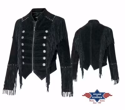 Svart snygg mockajacka i lite military look, nitar, vackra dekorknappar, dragkedja, fräckt sydd dekor, och fransar.