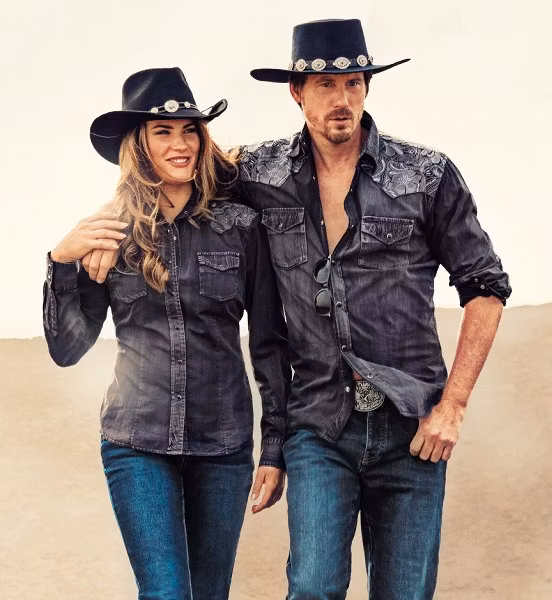 Cool western shirt in fade-out look with intricately embroidered western yoke in floral design. The patch breast pockets, the light-coloured decorative seams an