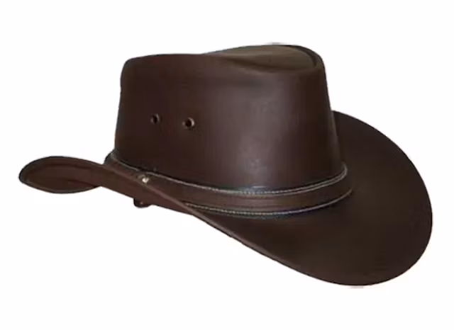 Magnificent hat with plain and woven belt. First class cow leather. Ventilation holes and chinstrap included.