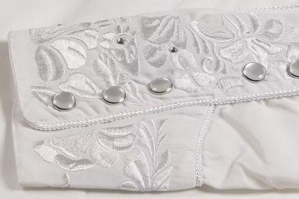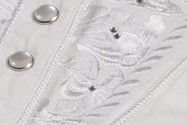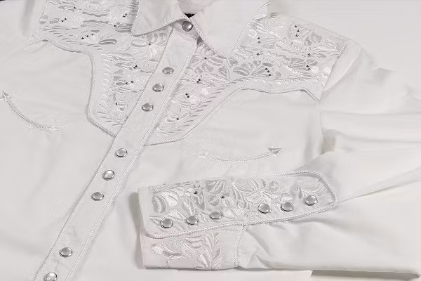 Exquisite white western blouse.Western yoke with great embroidery on the chest and back and delightful rhinestones.Harmoniously matched with cord piping and six
