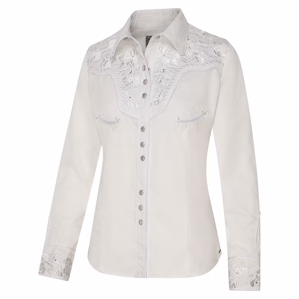 Exquisite white western blouse.Western yoke with great embroidery on the chest and back and delightful rhinestones.