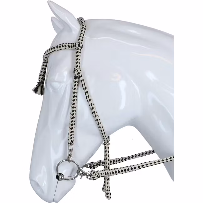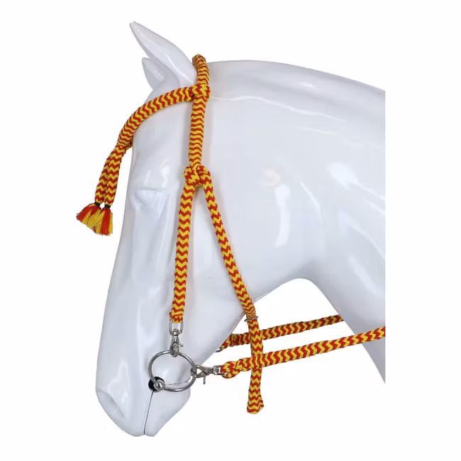 Träns av extra mjukt och tjockt rep av bomull (20 mm), perfekt även för hästar med känslig hud. 100% bomull. Steglöst justerbar. En storlek (cob/full/stor full). Helt utan spännen. I priset ingår även tyglar med karbinhakar, längd: ca. 320 cm. Du fäster bett eller nosdelen med karbinhakarna som ingår.