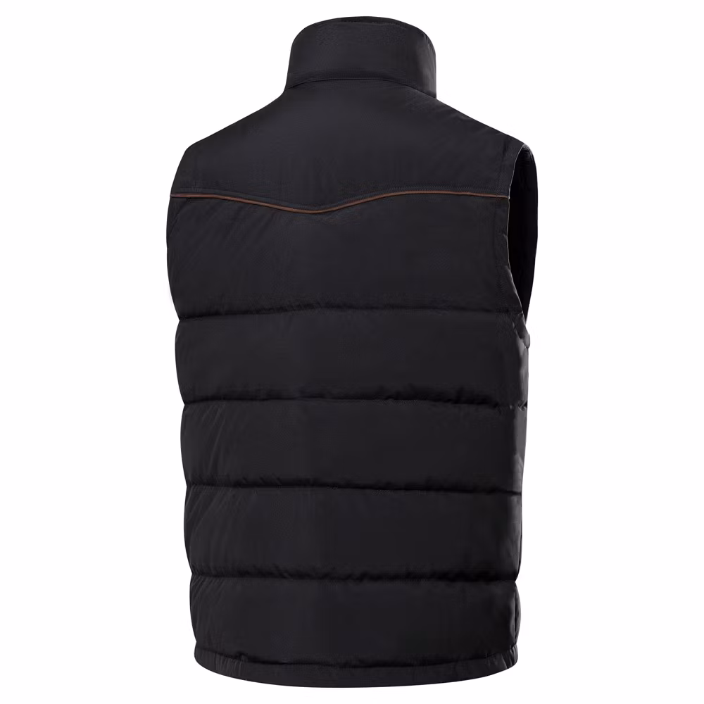 Quilted western down vest with piped western yoke. For wind protection the zipper is covered with a snap fastener. The two outside pockets and one inside pocket are each also provided with a zipper.
