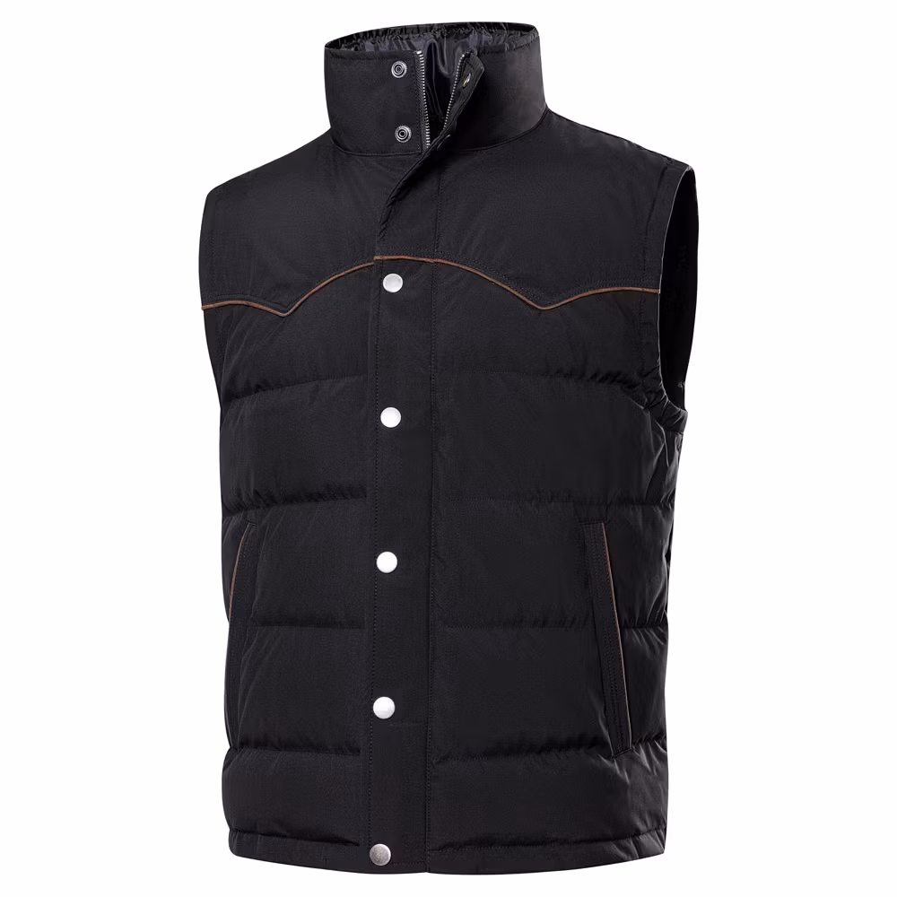 Quilted western down vest with piped western yoke. For wind protection the zipper is covered with a snap fastener. The two outside pockets and one inside pocket