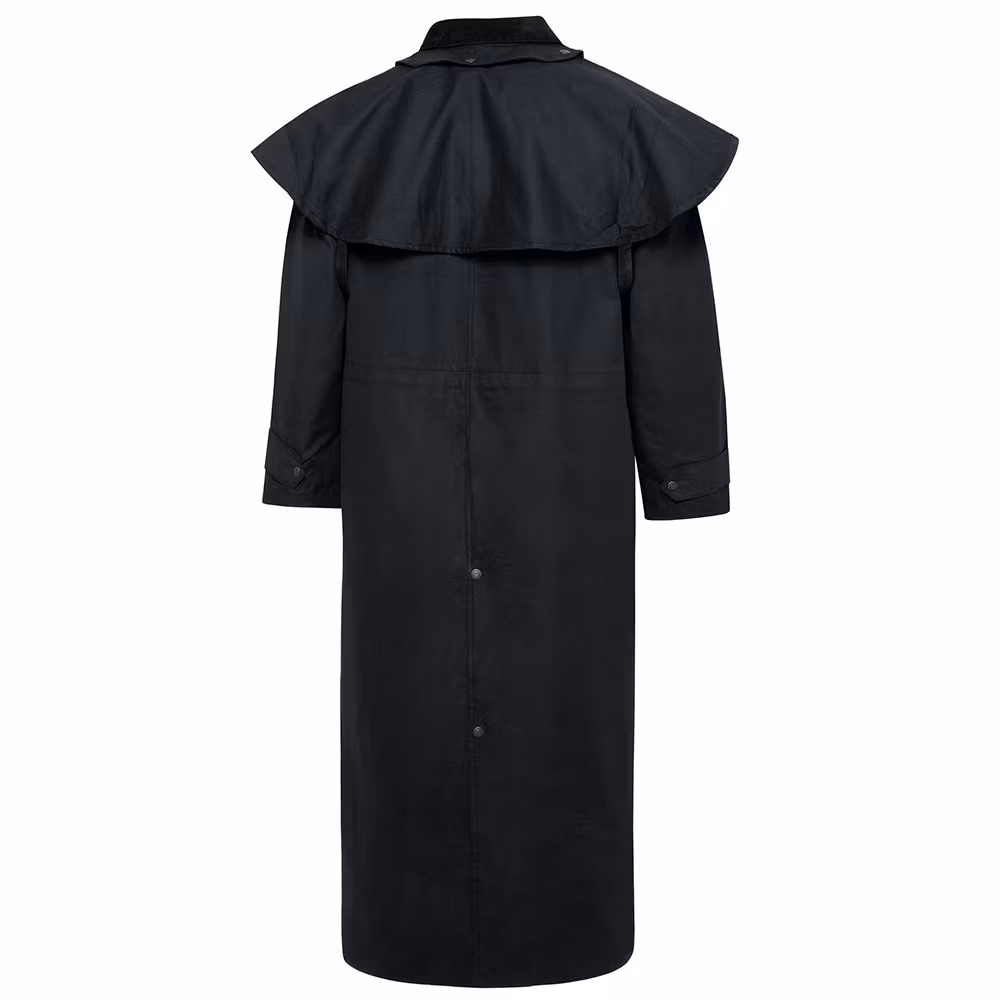 This durable western duster is made of sturdy, water resistant, 100 % cotton oil cloth and lined with warm black flannel.