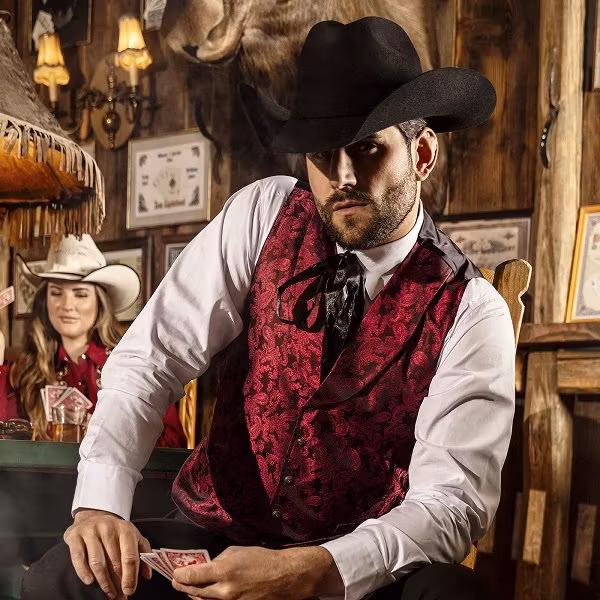 Exquisite western old-style vest with noble paisley pattern and decorative metal buttons, adjustable at the back by crossbars.