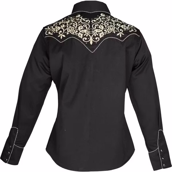 Elegant westernblus med distinkt broderi och skimrande strass på framsida och baksida av ryggen.Med tvåfärgad stringpiping och westernmanschetter.