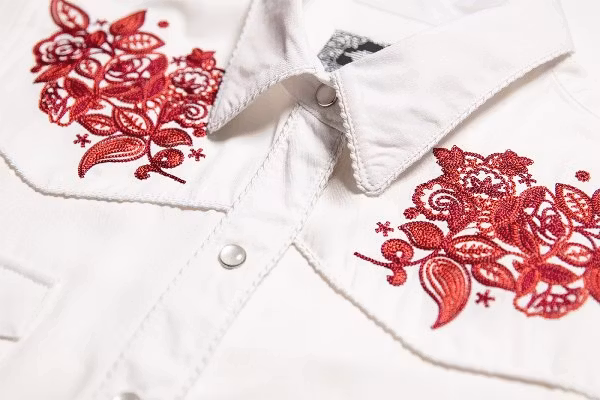 Cute, elaborately embroidered short-sleeved western blouse with a western yoke, patch breast pockets and white, shimmering press studs. A special accent is the cord piping on the button placket, collar and sleeve cuffs and western yoke. The blouse has 2 darts at the back, giving it a soft, flowing look and giving the wearer a stunningly feminine figure.