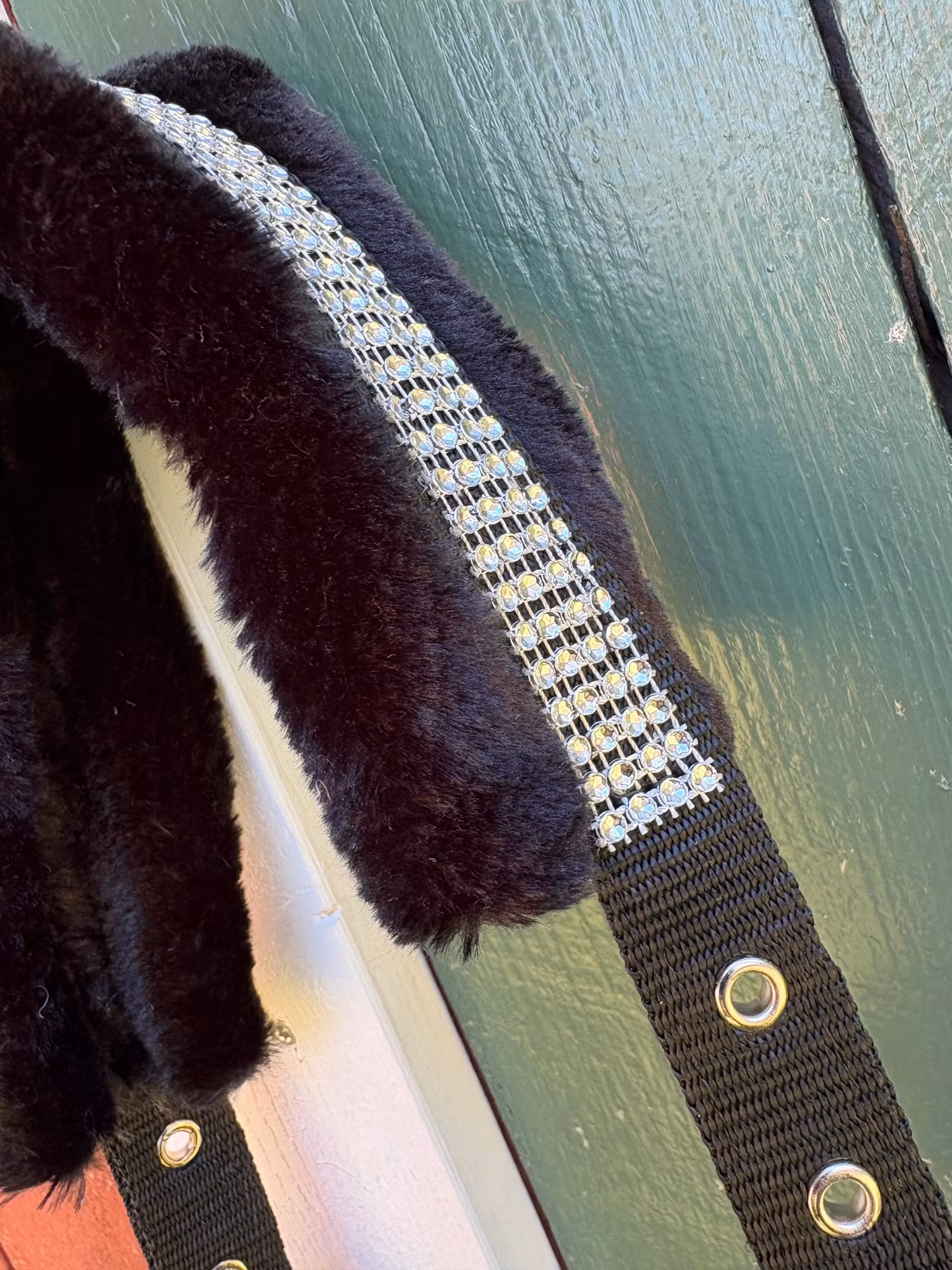 Grimma i polypropylen. Ställbar i nacke på båda sidorna och även under nos. Pistolhake på vänster sida. Med strass och piléfodring ton i ton på nacke, nos och s