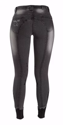 Mjuk och stretchig denim byxa med blekta effekter. Sadelskuren, silicon skodd. Fem ficks modell med dragkedja på myntfickan. Benslut med lycra på utsidan.