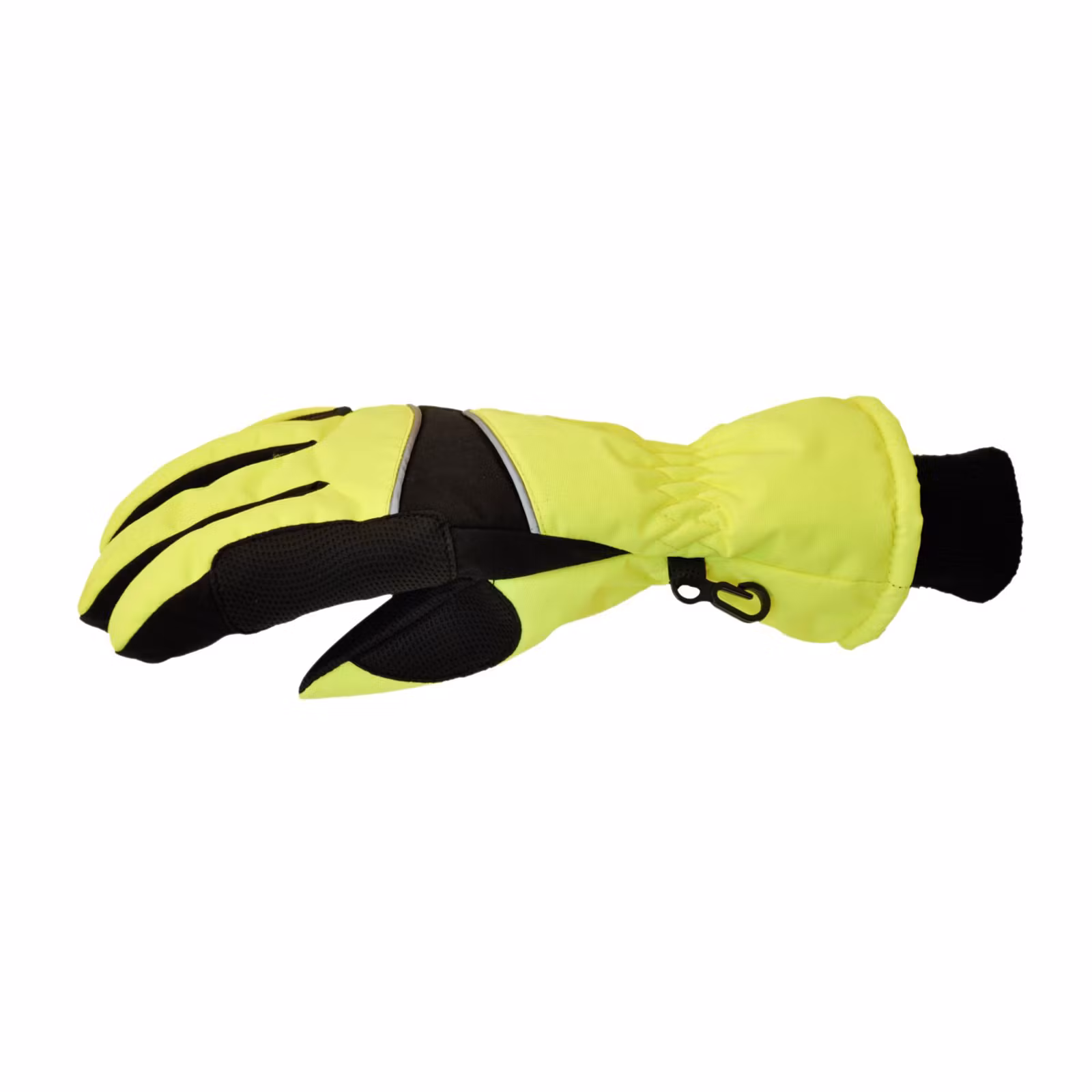 Vinterhandske i fluorescerande neonfärg med reflekterande detaljer. Varmfodrad insida av termofiber, stickad mudd vid handleden och förstärkning på fingrar för bättre grepp av tyglarna.