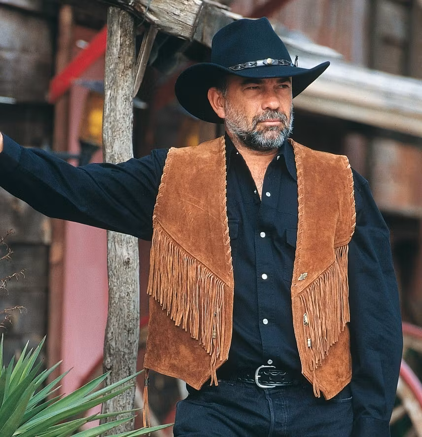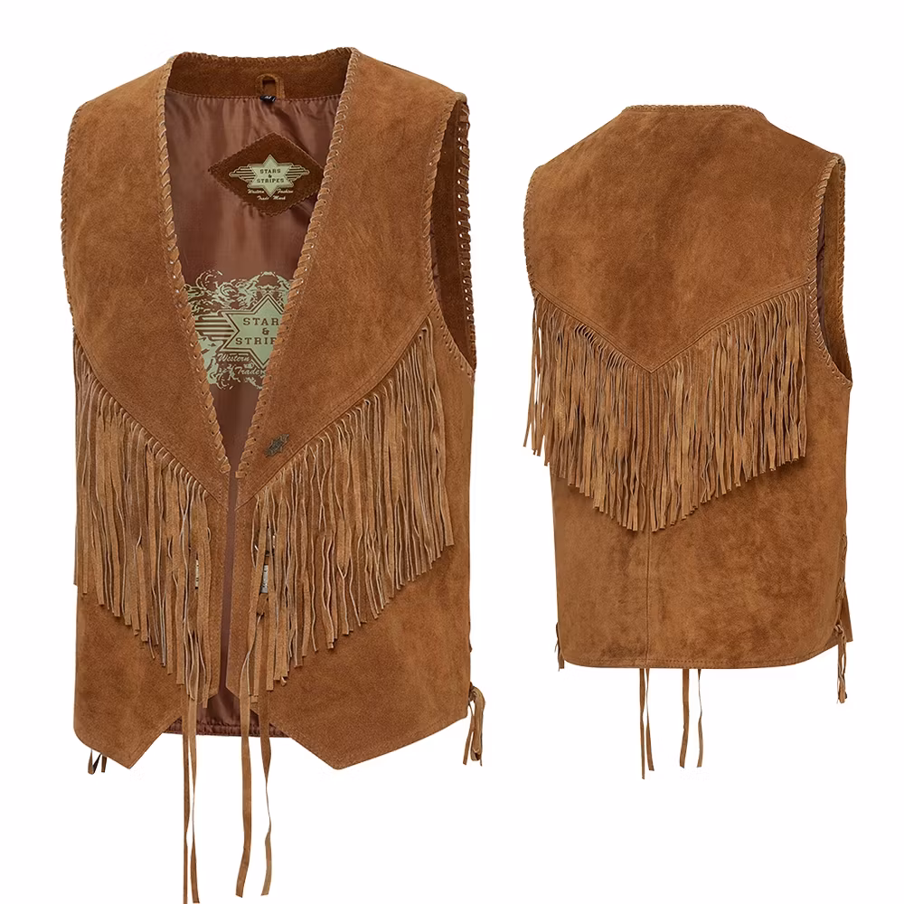 Western delad skinnväst med fransar, sydd fåll och sidoband. V-formade fransar på baksidan, en innerficka.