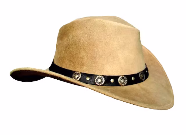 A magnificent tumble leather hat, rounded on the upper with a smooth black leather hat band with and  decorative but tons. Made of top-grain cowhide.&