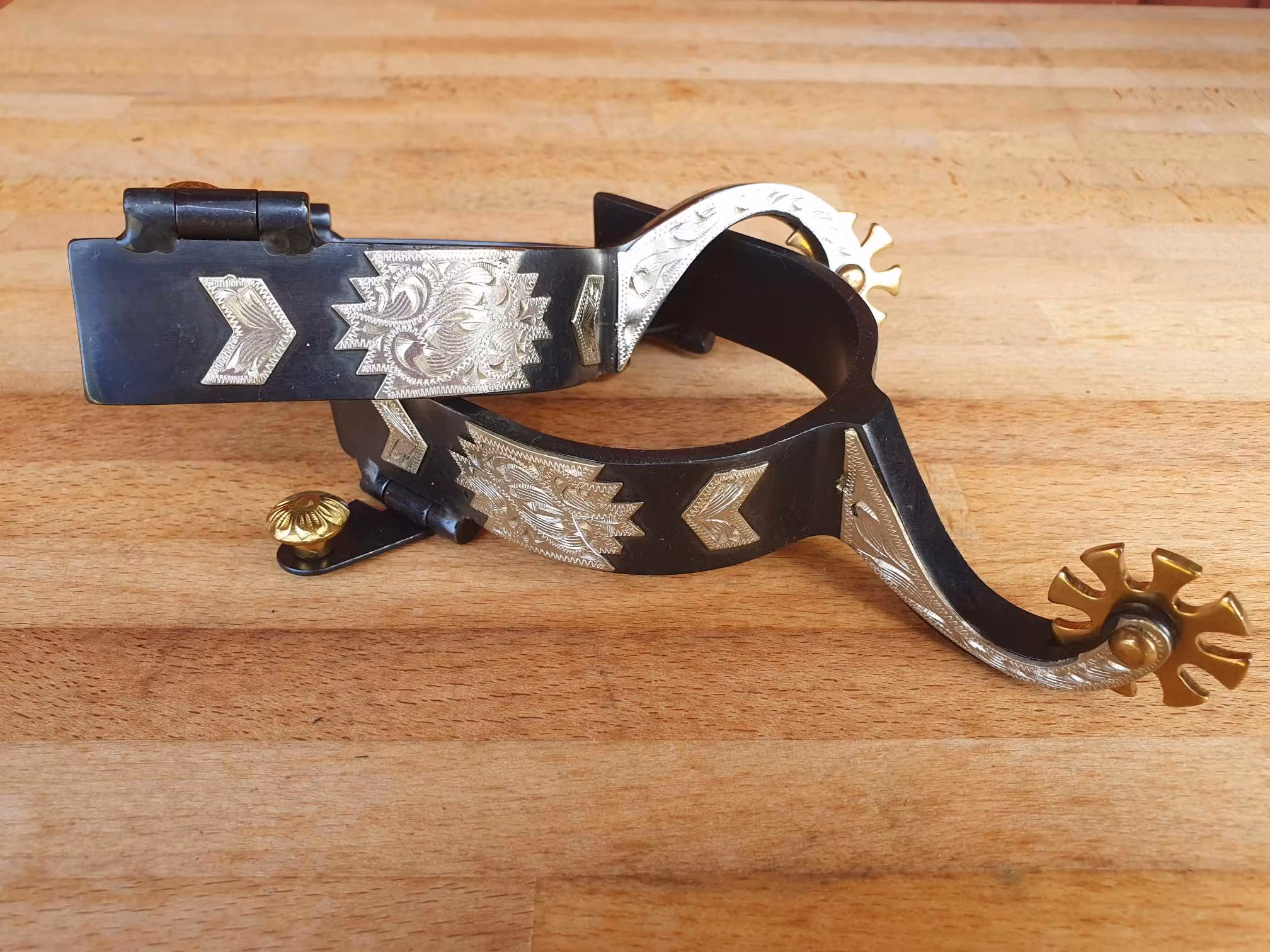 Cheyenne Spurs "goose neck" wide black spurs with engraving.