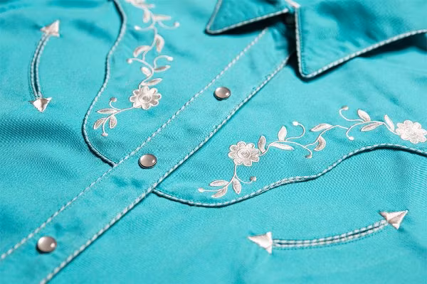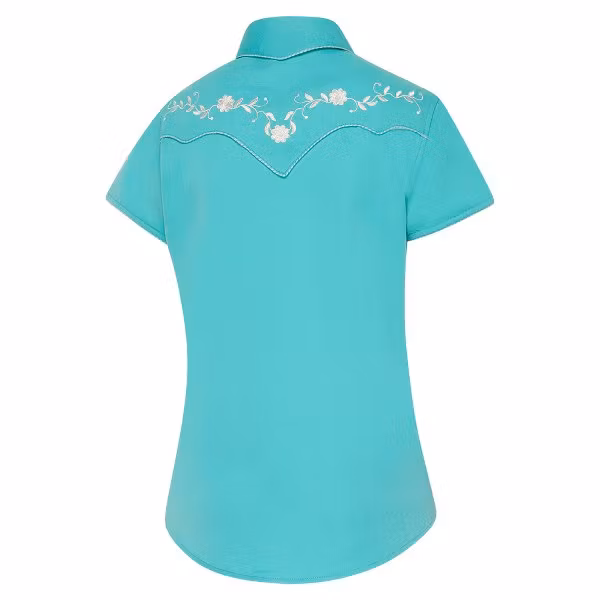 Enchantingly embroidered short-sleeved western blouse with western yoke, fake smileys and white, shimmering press studs. The two-tone cord piping on the button placket, collar and western yoke is a special accent. The blouse has a soft, flowing effect and gives the wearer a stunningly feminine figure.