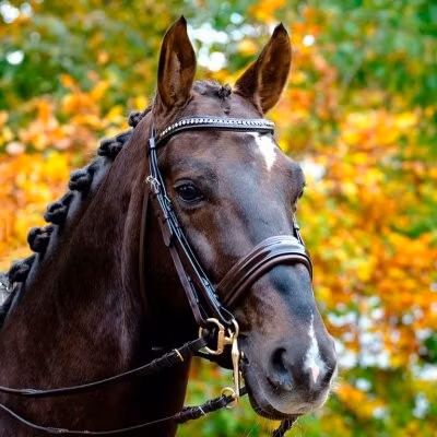 Ett elegant, mjukfodrat kandarträns av vegetabiliskt garvat buffelläder tillverkat i Indien. Med lackad nosgrimma samt lackat pannband med vit och grå strass. Nosgrimman är 40 mm bred med 7 mm tjockt foder samt har pullbackknäppning och sidostyckena har hooks för ett enhetligt utseende. Pannbandet och nackstycket är ergonomiskt formade för ökad komfort. Säljs med två par släta lädertyglar, 12 mm respektive 15 mm breda, även de med hooks. Beslag i rostfritt stål. • Tyglar längd: Cob – 240 cm. Full – 270 cm