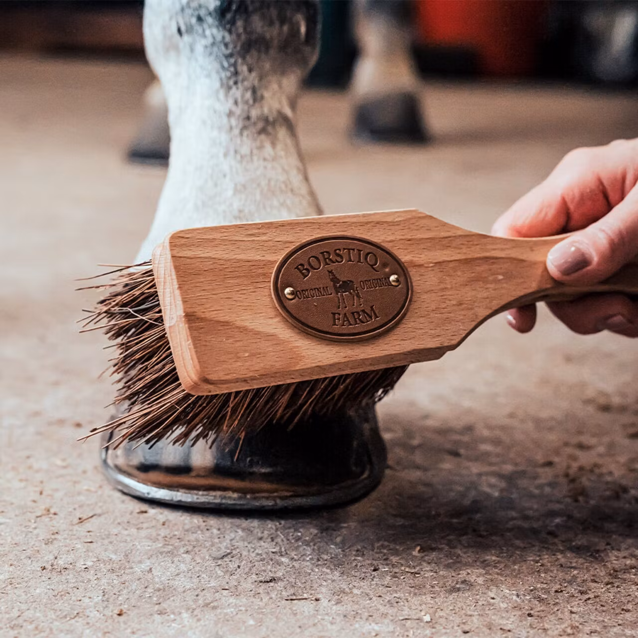 Populär borste för hästar med kraftig päls. Med ett handtag i lövträ för rejält grepp samt en läderrem att hänga den i.