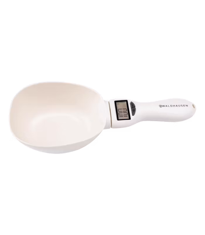 Den digitala foderskopan kan användas för att mäta olika typer av djurfoder och kosttillskott. För detta ändamål kan den växlas mellan följande måttenheter: gram, milliliter, koppar och ounces.