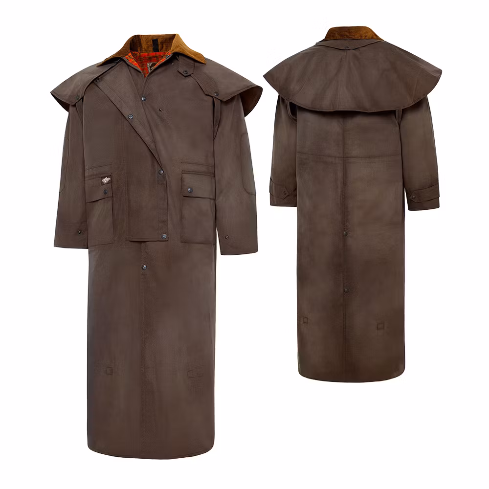 This durable western duster is made of sturdy, water resistant, 100 % cotton oil cloth and lined with warm red flannel.