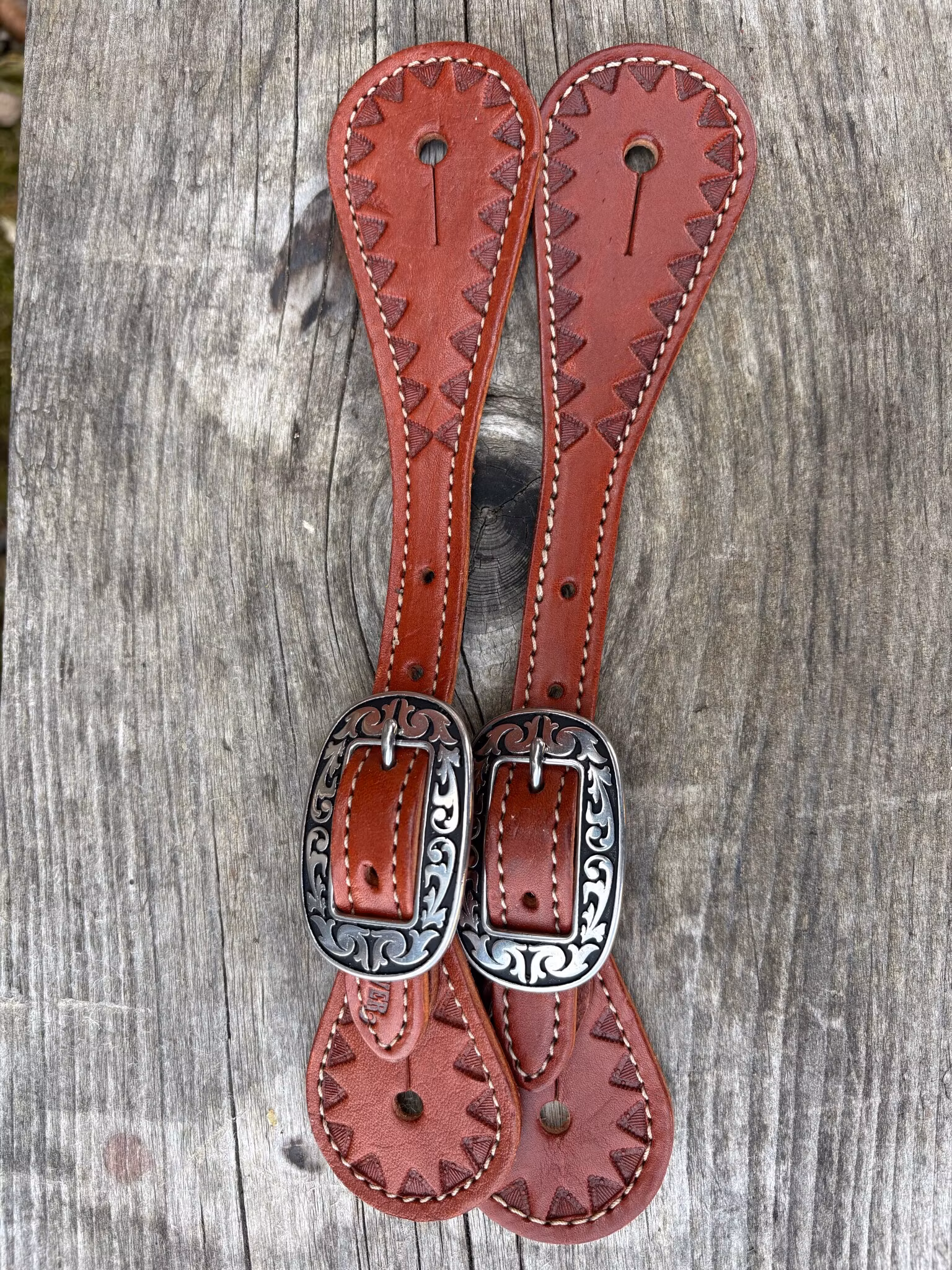 Weaver Youth Hand Tooled Triangle Border Spur Straps Chestnut