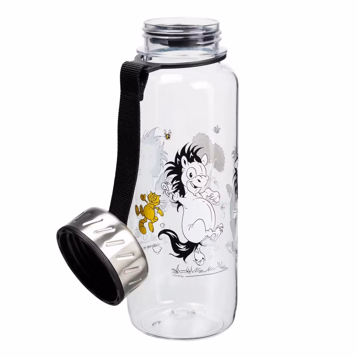 Vattenflaska i BPA-fri, hållbar tritan-plast. Flaskan är genomskinlig och prydd med glada Hästen Mulle-illustrationer av Lena Furberg. Illustrationerna är svart
